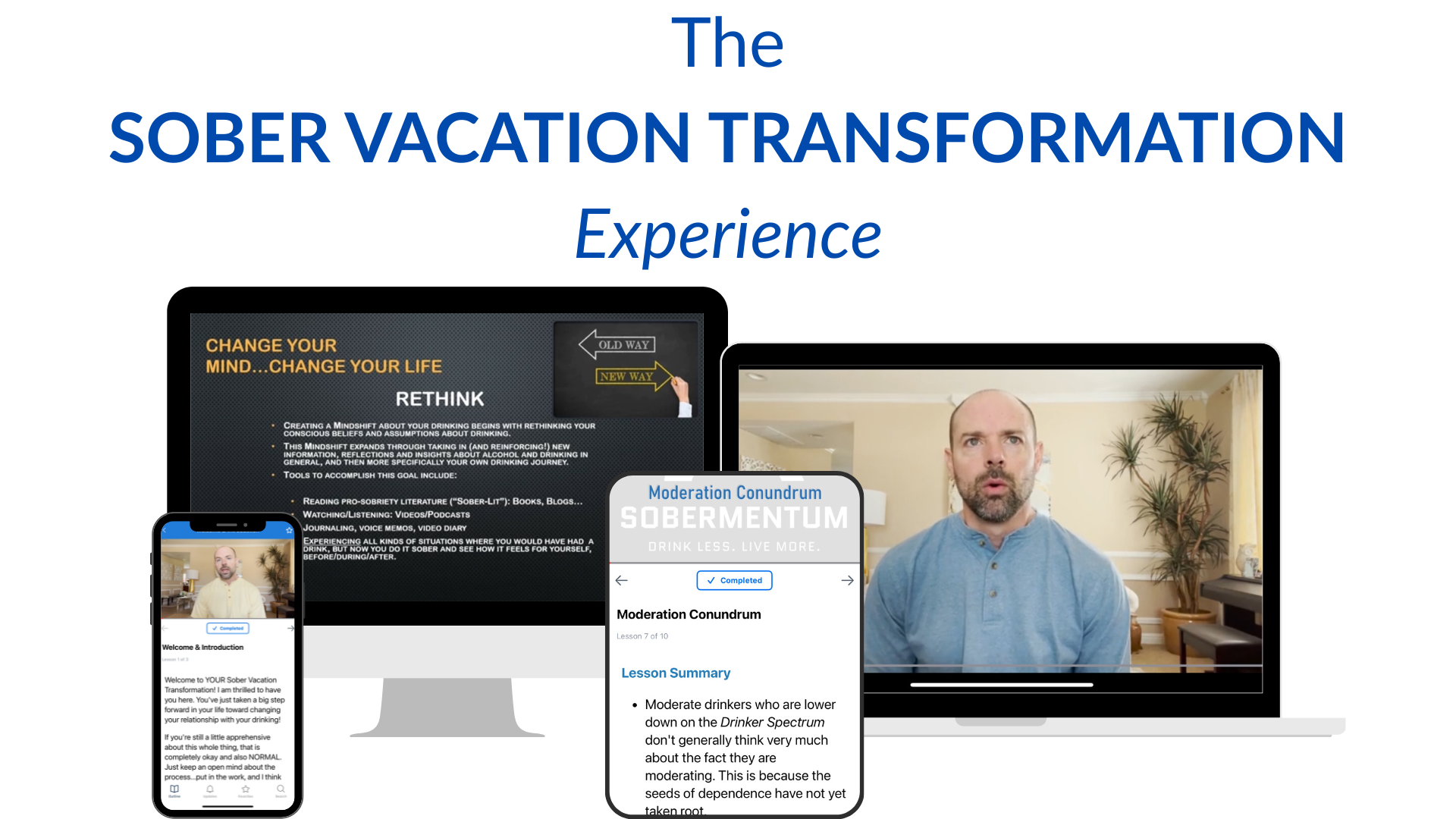 The Sober Vacation Transformation Experience is the foundational gateway to alcohol freedom. Designed as an immersive online and mobile app-based experience, it travels along with you, helping you unplug from your drinking routine and thought-patterns for a blissful vacation from alcohol that lasts as long as you determine.